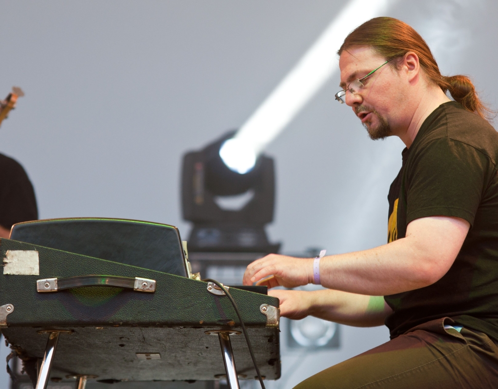 Eröffnet wird das Festival bei strahlender Sonne und angenehm luftigem Klima von einer vielleicht nur auf den zweiten Blick programmatischen Band für die Bandbreite der Veranstaltung von Traditionspflege bis hin zu wirklich progressivem Forscherdrang: Die frühen Canterbury-Einflüsse von SANGUINE HUM machen sich noch im weiten Dynamikspektrum ihrer neuen Stücke bemerkbar, was der gute Sound vor der Bühne – wie oben angedeutet bei nahezu allen Bands an diesem Wochenende gegeben – zusätzlich forciert. Ansonsten handelt es sich bei ihrer Musik um nachgerade programmatischen Neo Prog für Menschen, die bei Earl Grey mit Zucker und ohne Milch über ihre Befindlichkeit plaudern. Nichtsdestoweniger sind es die leider seltenen treibenden Parts, beispielsweise während des Longtracks “System For Solution”, durch die das sonnenbadende Publikum am frühen Nachmittag zum artigen Klatschen animiert werden. Die bisweilen zwischen synthetischen Loops und gediegenen Riffs changierenden Stücke scheinen oftmals zu behäbig zu plätschern, was vor allem an der Achillesferse an der Spitze der Combo liegt: Wo Joff Winks' helleres Timbre (auch mit Hinblick auf den Stil der Oxforder bieten sich Geddy Lee beziehungsweise neuere Rush als Vergleichspunkte an) auf den beiden Studioalben eigentlich gefällt, trägt es die nuancierten Stücke der Gruppe live zumeist nicht, weil es dem Frontmann sowohl an Ausdruckskraft als auch Stimmgewalt mangelt, wie sie die immerzu nuancierten Stücke erfordern. So verpuffen viele Feinheiten des prinzipiell sehr zugänglichen Materials, das sich zur Eröffnung des Festivals bei aller Kritik trefflich eignet. Dass das einzige Mitglied, das ein wenig Lockerheit versprüht, der sitzende Keyboarder Matt Baber ist, spricht allerdings bezüglich der ausbaufähigen Performance der Truppe Bände. Als Glanzlichter im Set erweisen sich das fragile „Derision“ sowie der früh gespielte Neuling „From The Ground Up“, eine in ihrer Verbindung von warmen Orgel-Sounds und subtil elektronischem Pluckern mit einem liedhaften Charakter (Stichwort zudringlicher Refrain) für den momentan Sound des Quartetts bezeichnende Komposition.