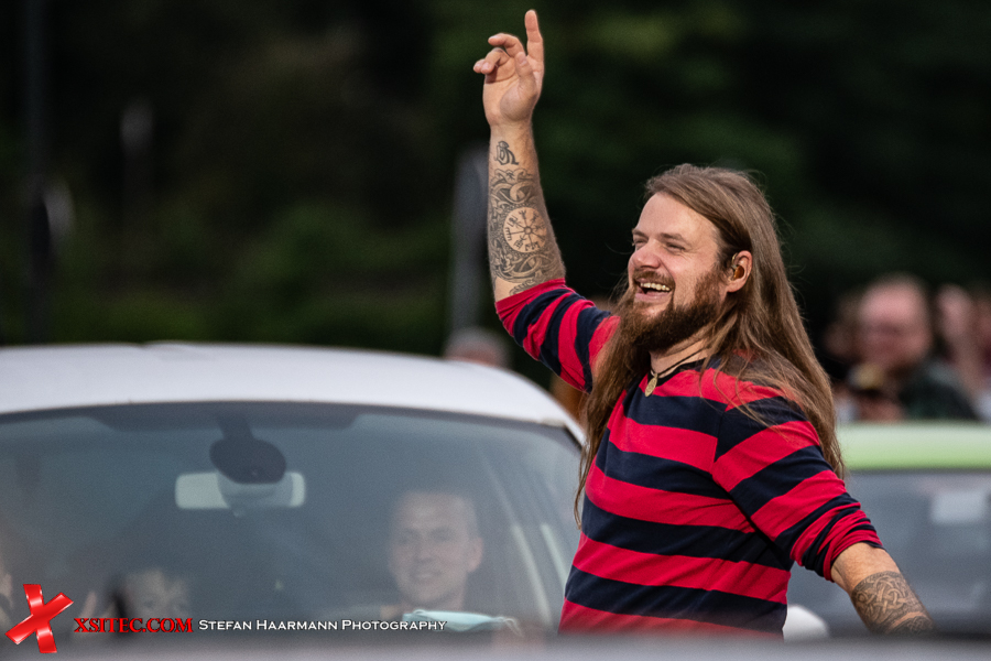 Am heutigen Abend jedoch ist vieles anders - vorbei die Zeiten, als man im Publikum dichtgedrängt stehen und feiern konnte. Die Kolonne der Autos steht im Halbkreis um die Bühne, die leichte Lockerung der Hygienevorschriften erlaubt glücklicherweise, dass die Besatzungen der jeweiligen Vehikel immerhin vor oder neben ihren Auto stehen können. Wie schon bei Mr. Hurley und Mr. Irish Bastard gibt es zur Freude der Fans einen Merch-Stand, der sich zunächst im Schritttempo durch die Reihen bewegt, im weiteren Verlauf aber einfach stehenbleibt, denn die extra für die fünf Konzerte umfassende VERSENGOLD Autokino Sommertour 2020 aufgelegten T-Shirts finden reißenden Absatz.